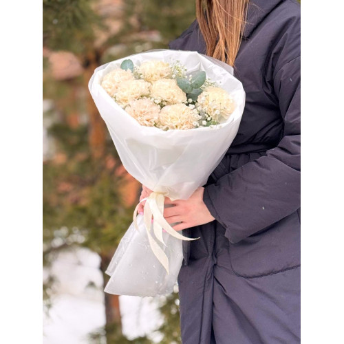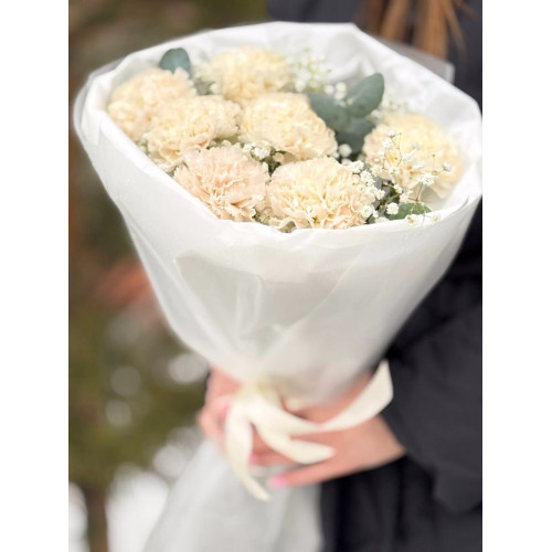 Состав букета : Диантусы розовые - 7 шт, гипсофила - 2 шт, эвкалипт, упаковка тишью и матовая плёнка.